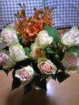 カーネーションと何かで見本を作ろうと思っていたけれど、一束の余りの多さにバラとランを購入。写真の、うすーくピンクで化粧された白いバラ10本とオレンジ色のラン10本で¥836!バラは長さが70センチくらいあって、ランは一つ一つにお水のボトル?が付いている。卸しなのでバラに棘が付いたままだし新聞紙にくるんで渡されたけど、なんだかそれが逆に嬉しかったり。