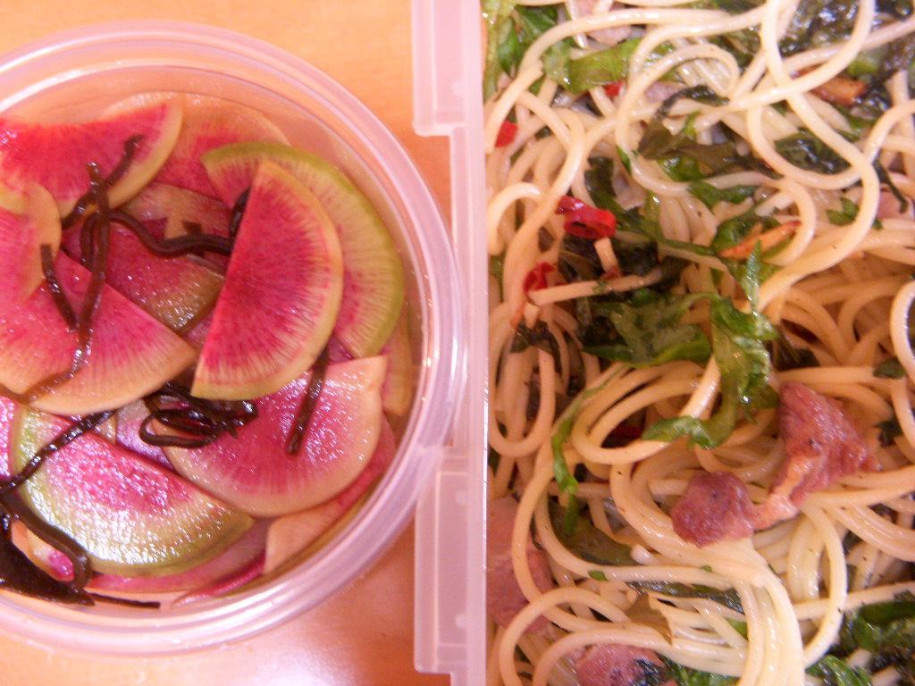 早速お弁当に。見た目には分からないけど、豚肉ペペロンチーノ風パスタに3束入っている。サラダは、ご実家のおしゃれ野菜を分けてくれたカホリちゃんの、赤カブ。味はもちろん目にも美しい。幸せ~♪