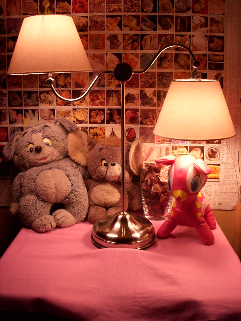これが今回の買い物、へんてこライト!とりあえず彫金机の上に。もうひとつのライトは、上京した時に購入した無印のライトスタンド。これで間接照明の部屋がやっと出来上がった!あ、トム&ジェリーは幼稚園の頃のクリスマスプレゼントで、大好きだったトムだけをもらった私が”ひとりじゃかわいそう…”と呟いた結果、後日ジェリーもやって来たという逸話が。