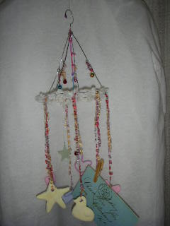 輪から垂らした毛糸の先に、紙粘土で作った飾りやクリップを付けて完成。