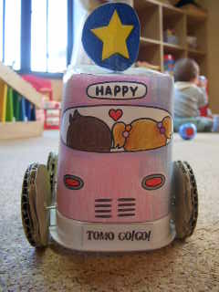 手で持って走らせると、タイヤに連動して屋根の星が上下します。 お絵かきとお遊びの両方を親子で体験していただきます。