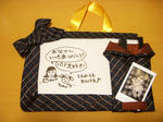 ネクタイの端をポケットとして使ってペン立てに、裏の”通し紐”を利用して写真などを飾ります。ダンボールとクリアホルダーの間に紙を挟んで、文字が読みやすいようにしています。見本品はホワイトボードに見立てて方眼紙を使っていますが、色紙などでカラフルにするのも良いでしょう。