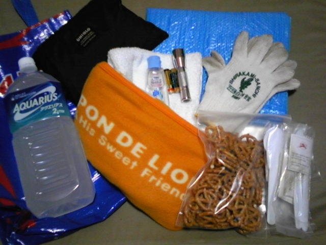 防水袋、ブルーシート(銀色のアレが欲しいところだけど)、ウィンドブレーカー、ブランケット、タオル、消毒ジェル、軍手、懐中電灯、電池、スポーツ飲料(水が手に入ったら交換)、食べ物(プレッツェル)、カトラリー。