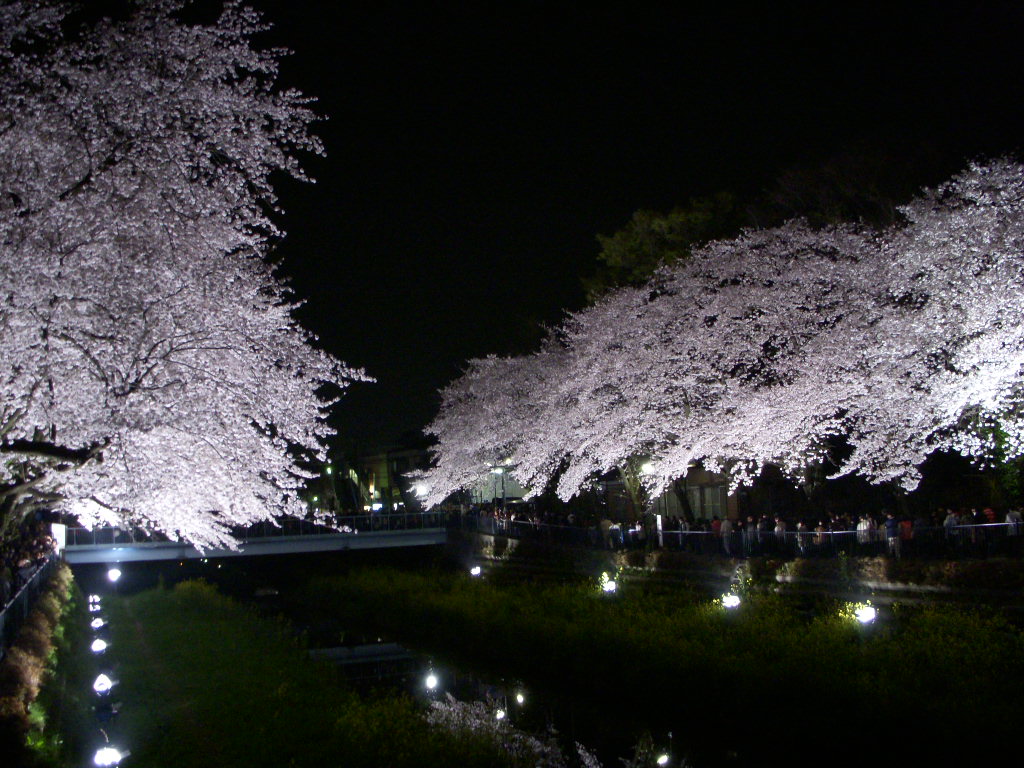 近所の野川沿いに咲く桜並木のライトアップ。