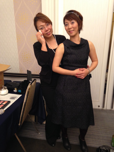 Make-up artistのマキさんにコツの指導を受ける友人、