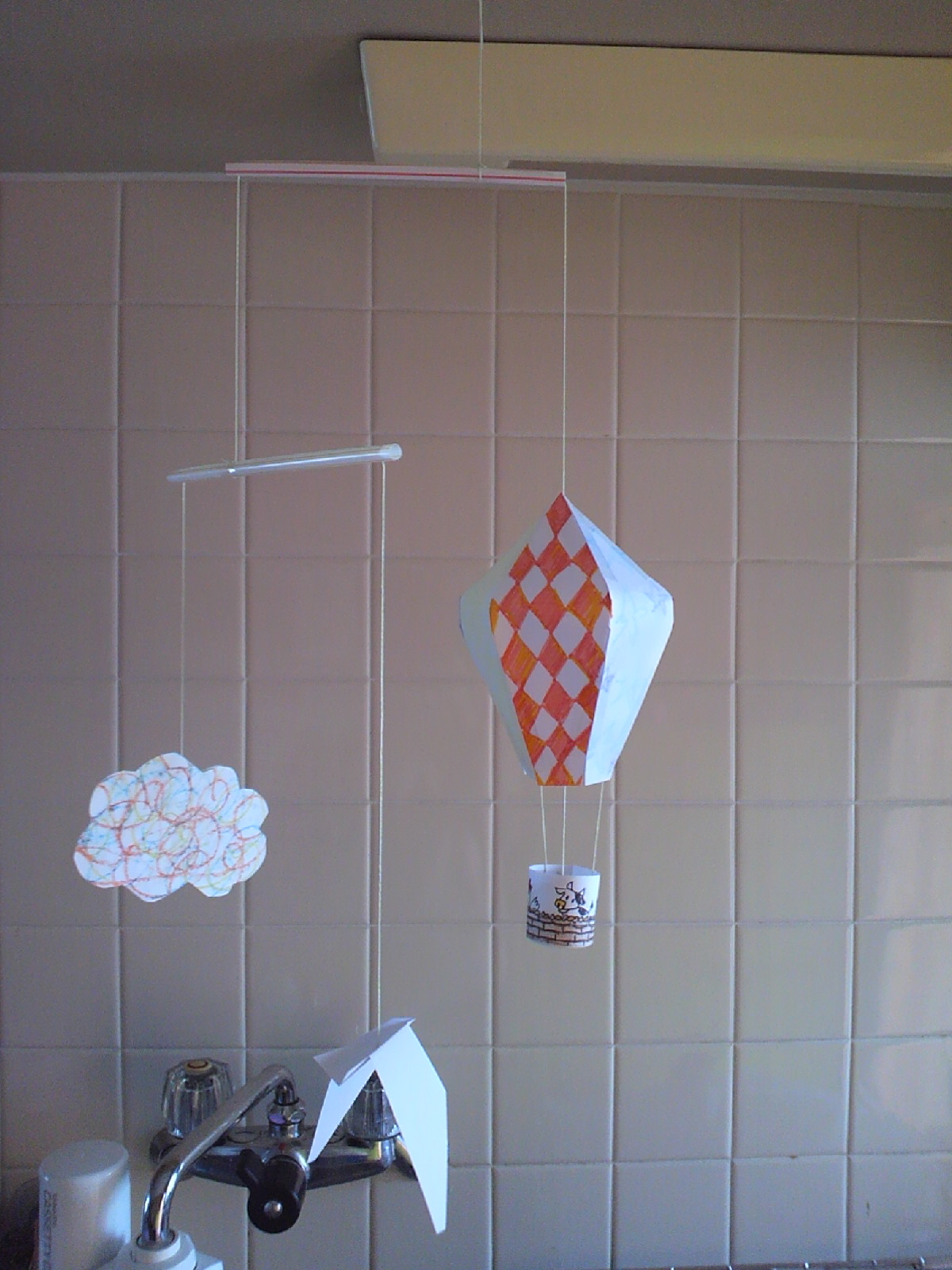 おうちにある物で、お子さんと一緒に簡単に作れる”気球のモビール”です。