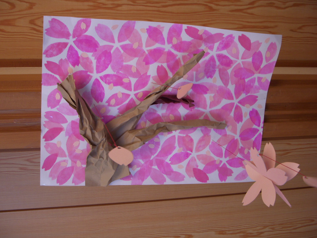 画用紙に、濃淡を付けたピンクでさくらの花をステンシルします。 茶色の画用紙をちぎったり握ったりして枝を作ったら、モビールを好きなところに下げて、作業の締めには桜の花吹雪で遊びます。画用紙にのりを点々と付けて絵の中にも花吹雪を舞わせれば、より立体感が出て賑やかに。