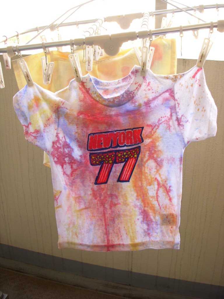 今回は小さなお子さんも楽しめるように、水鉄砲で染めてみました。赤、青、黄色の三原色を、水鉄砲の中で混ぜたり、服の上で混ぜたりして、「今度は何色になるかな??」「オレンジだー!」「あ、紫!」「緑だよー!」などなど、いろんな変化に大人も子どもも一緒になって楽しめます。
