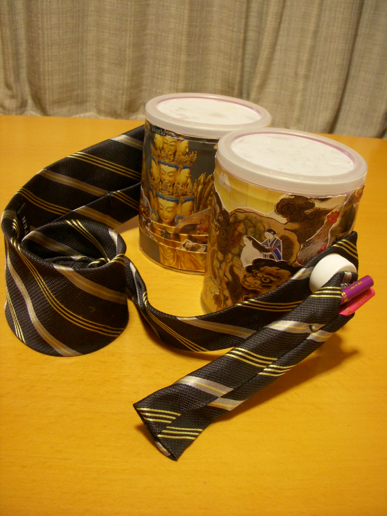 蓋も、裏の缶の部分も打楽器としてじゅうぶん使えるはず。肩紐にネクタイを使い、細い方の端をスティック入れとしても使用。写真は色鉛筆だけど、消しゴムつきの鉛筆で後日動画を撮影するつもり。鉛筆の両端でどれくらい違う音になるか楽しみ。